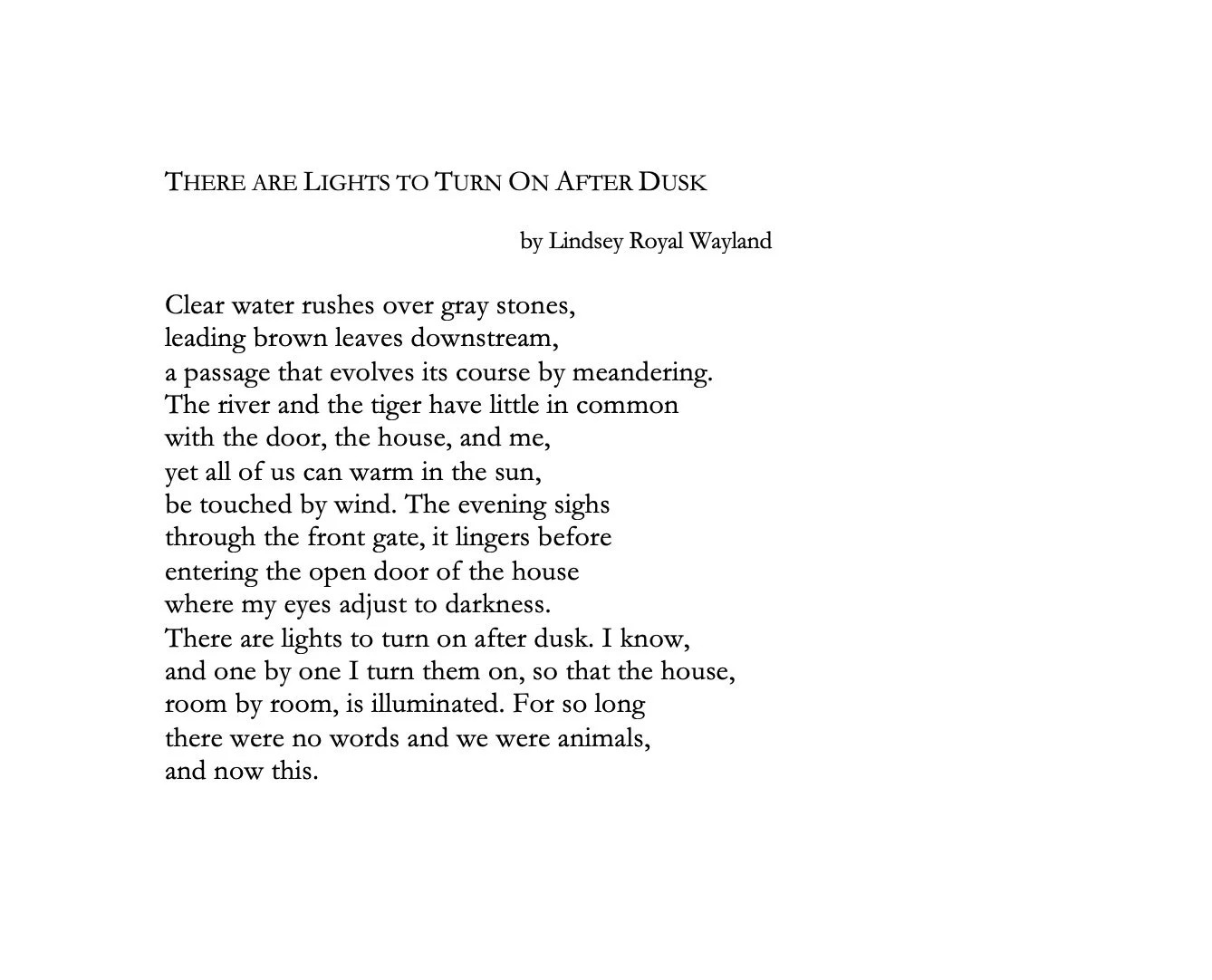 “There are Lights to Turn On After Dusk” RHINO Poetry, winner of Founders’ Prize, 2026,
